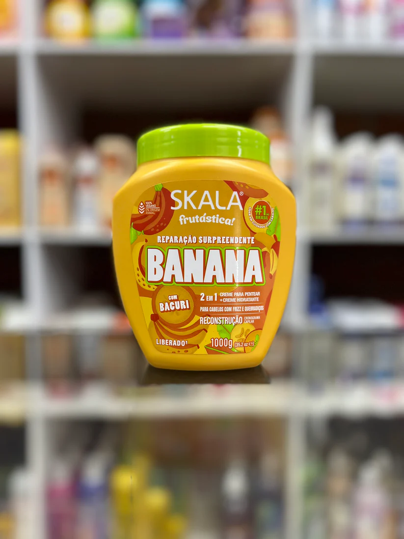 La línea Skala Banana (a menudo con Bacurí) es una gama de productos capilares veganos, liberados (sin sulfatos, parabenos, etc.), enfocados en la nutrición, reparación y brillo para cabellos secos, dañados, con frizz o quebradizos, incluyendo una mascarilla 2 en 1 que sirve como tratamiento profundo, acondicionador, crema para peinar y co-wash, aportando vitaminas y lípidos esenciales para fortalecer la fibra capilar y restaurar el bienestar del cabello.